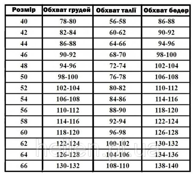 | Розмір жіночого одягу (UA) | 42, 44, 46, 48, 50, 52, 54, 56, 58, 60, 62, 64,66 |
